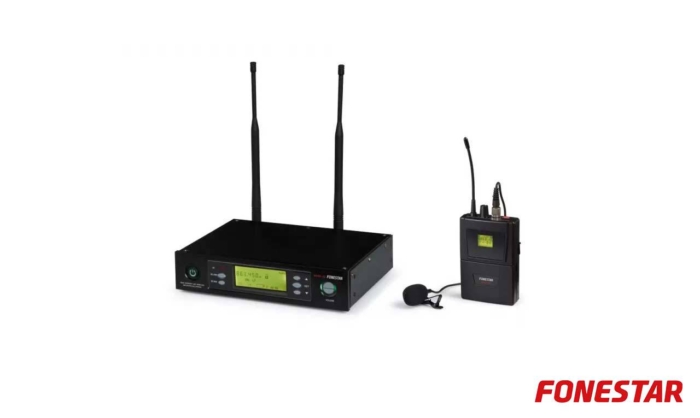 Tie-clip microphone with unidirectional electret condenser capsule & wireless belt-pack transmitter. Infrared channel to microphone transmission.