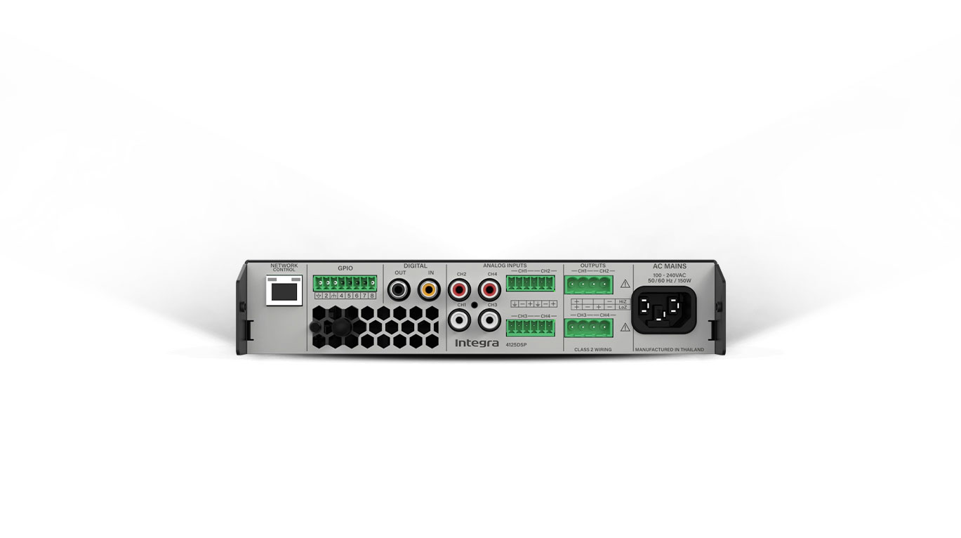 With 4 x 125W @ 4 ohms/8 ohms, 2 x 250W @ 70/100V the all-new Integra 4125DSP Professional Amplifier provides precision amplification to upscale sites like bars or restaurants, with integrator-friendly installation and control.