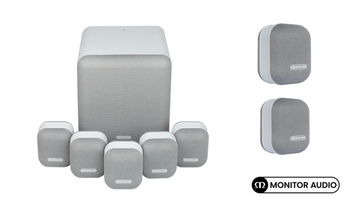 Monitor Audio 7.1 Mass Surround Sound package in Mist (White/Grey) . Full-scale audio fidelity from compact, stylish speakers and a discreet subwoofer, MASS combines all Monitor Audio’s award-winning expertise with sophisticated looks.
