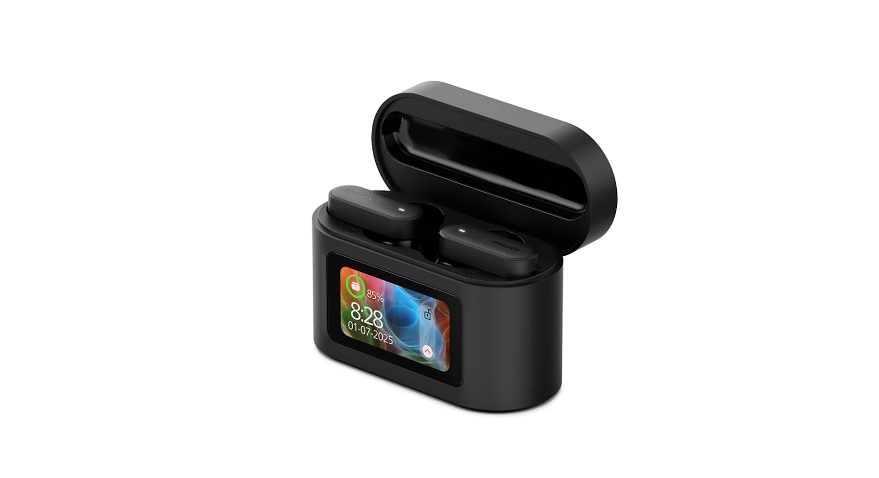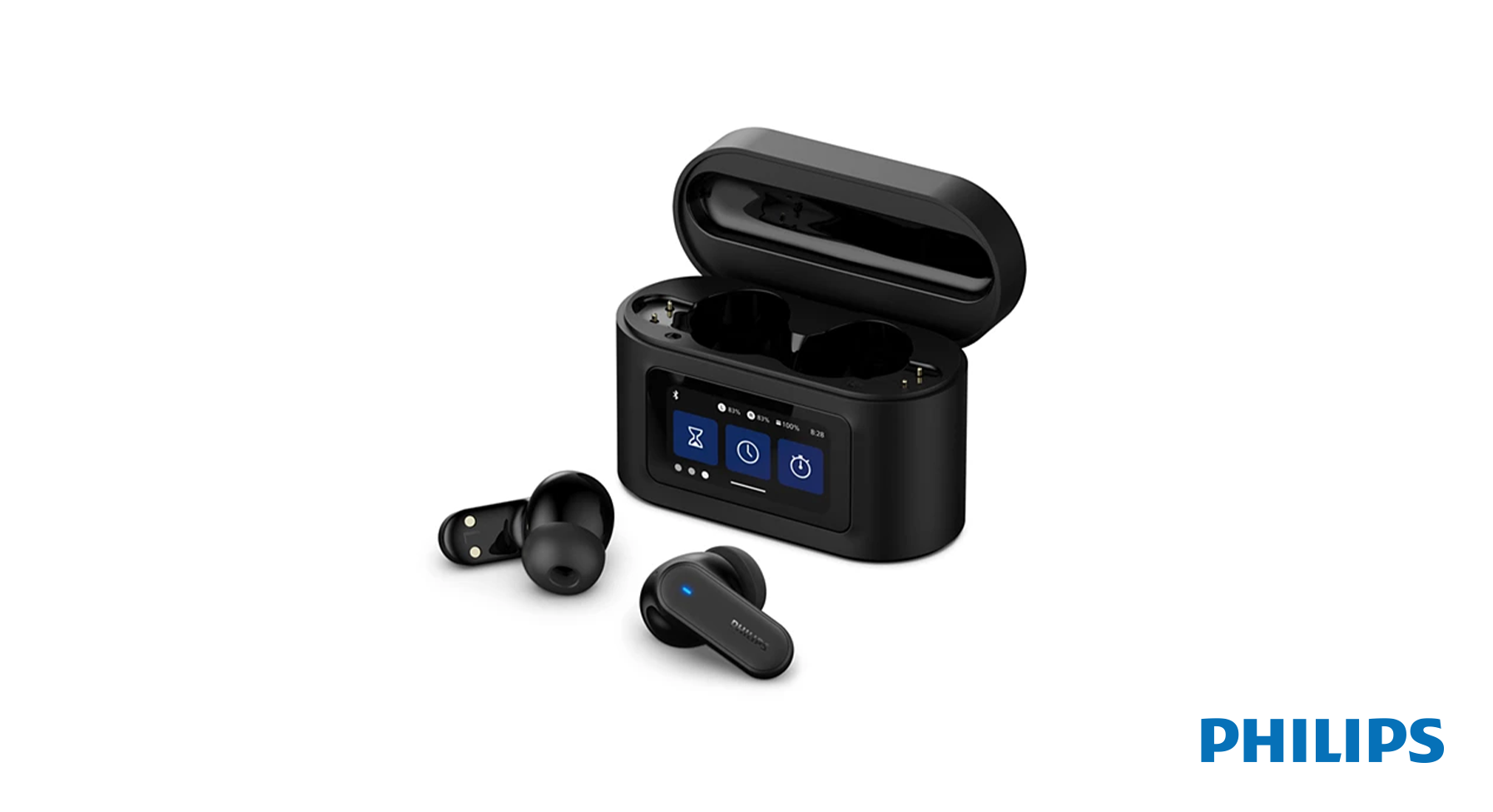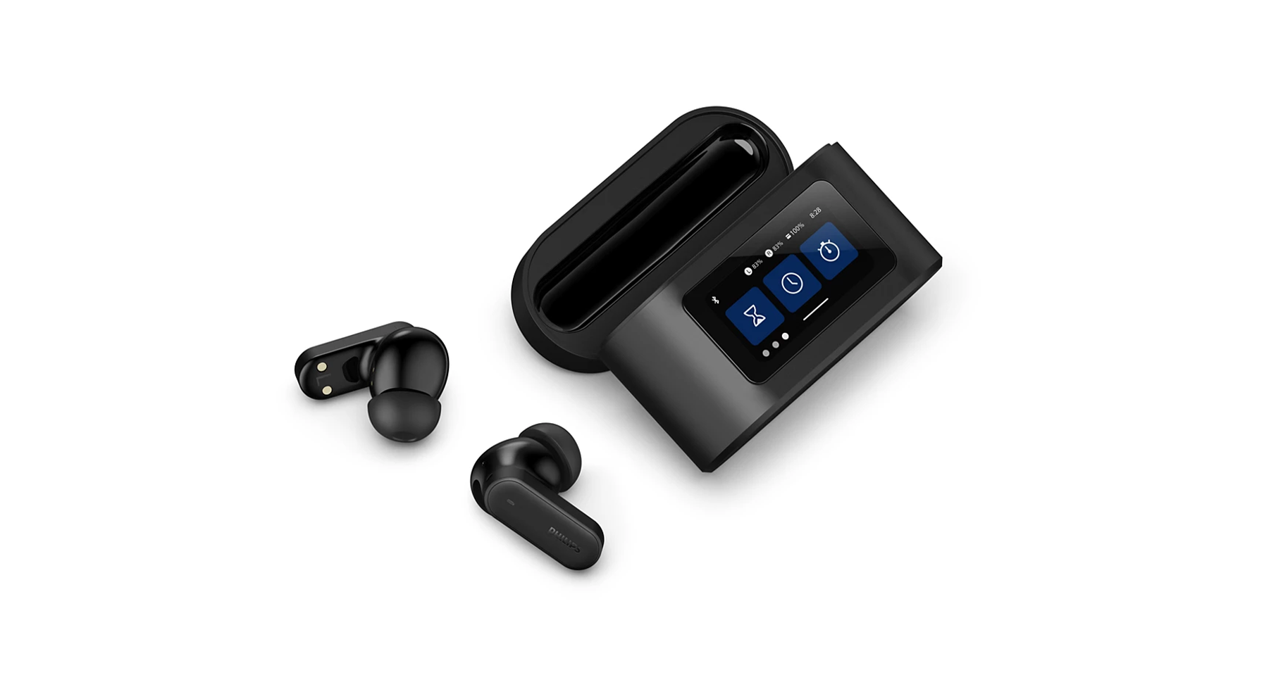 You can use this case to take calls, control playback and noise cancelling, tweak bass and treble, or find a missing earbud. The 1.47″ touchscreen also features a clock and a timer, plus a torch function that emits bright white light. A true multitasker, the case can even take photos by remotely triggering the camera on your connected device.
